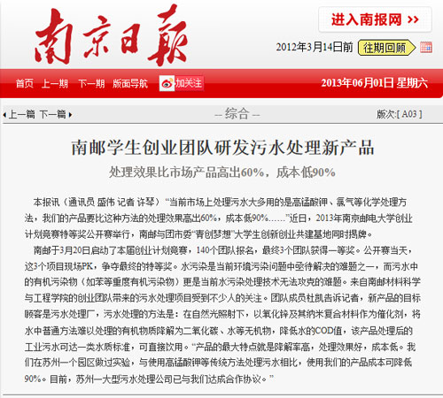 【南京日報】南郵學生創業團隊研發污水處理新產品