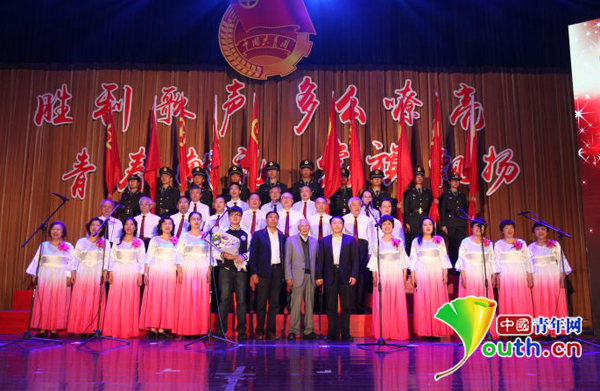 中國青年網北京4月29日電(記者 孫其)“萬泉河水清又清,我編斗笠送紅軍,軍愛民來民擁軍,軍民團結一家親,一家親……”今年是紅軍長征勝利80周年。4月28日晚,在南京郵電大學“五四”評優表彰大會暨紀念紅軍長征勝利80周年大合唱比賽現場,伴隨著委婉動聽的《萬泉河水》旋律,104歲長征老紅軍、抗戰老戰士、南京郵電學院首任黨委書記兼院長秦華禮與千名師生同唱紅歌,歡慶長征勝利80周年。