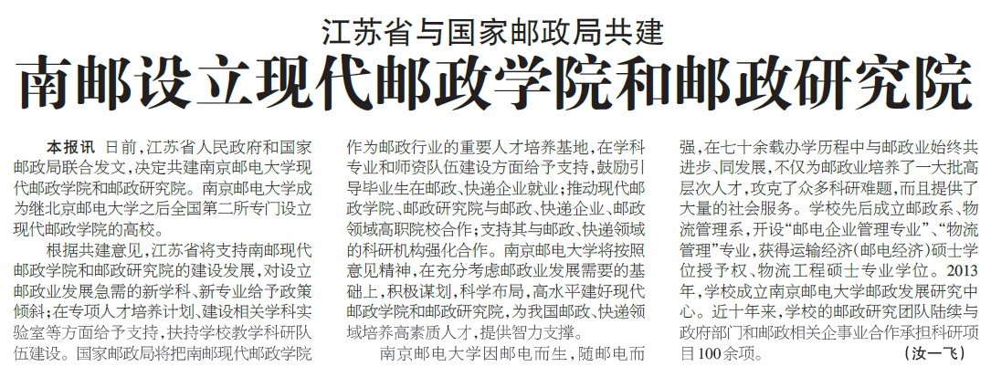 【中國郵政快遞報】南郵設立現代郵政學院和郵政研究院