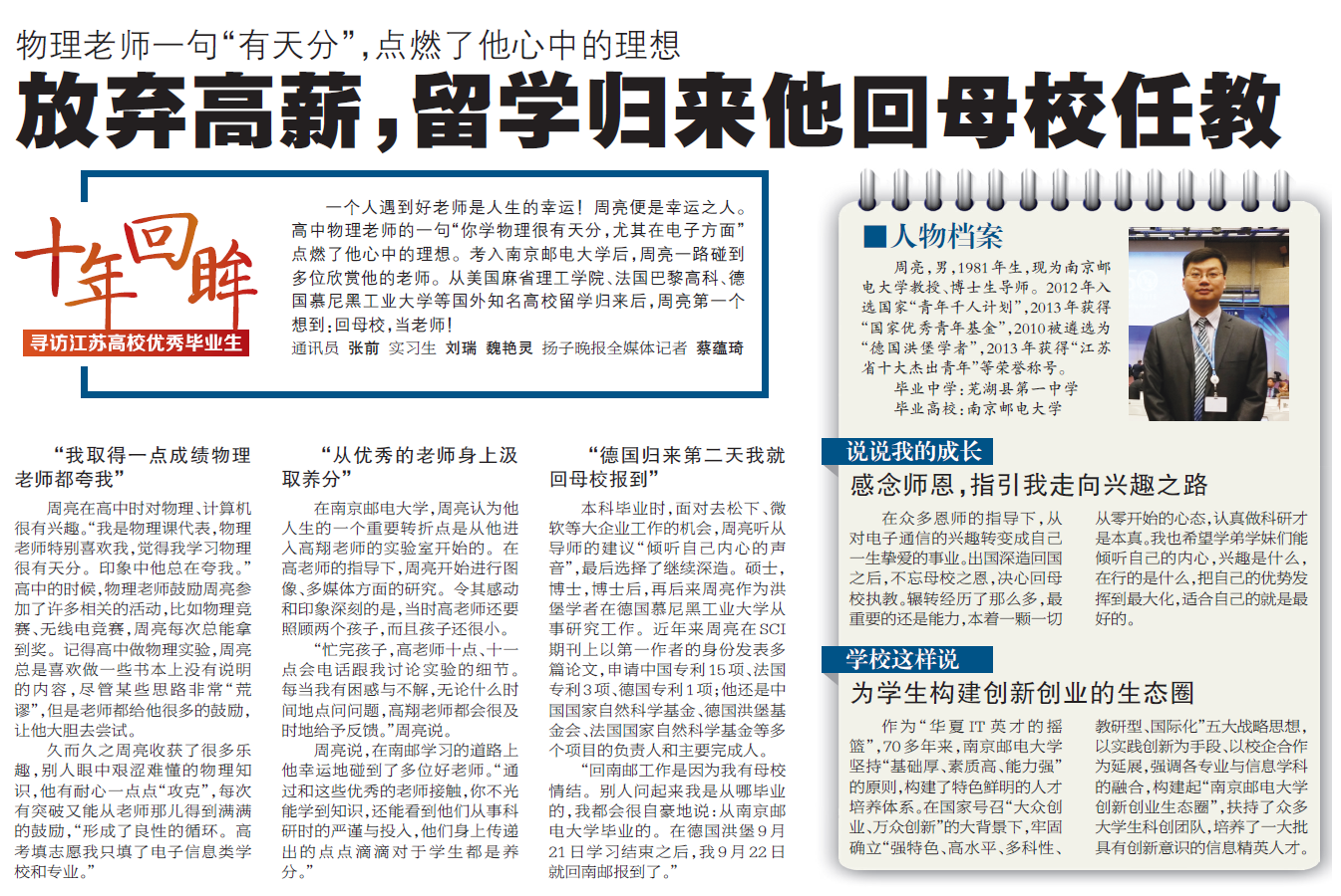 【揚子晚報】放棄高薪,留學歸來他回母校任教