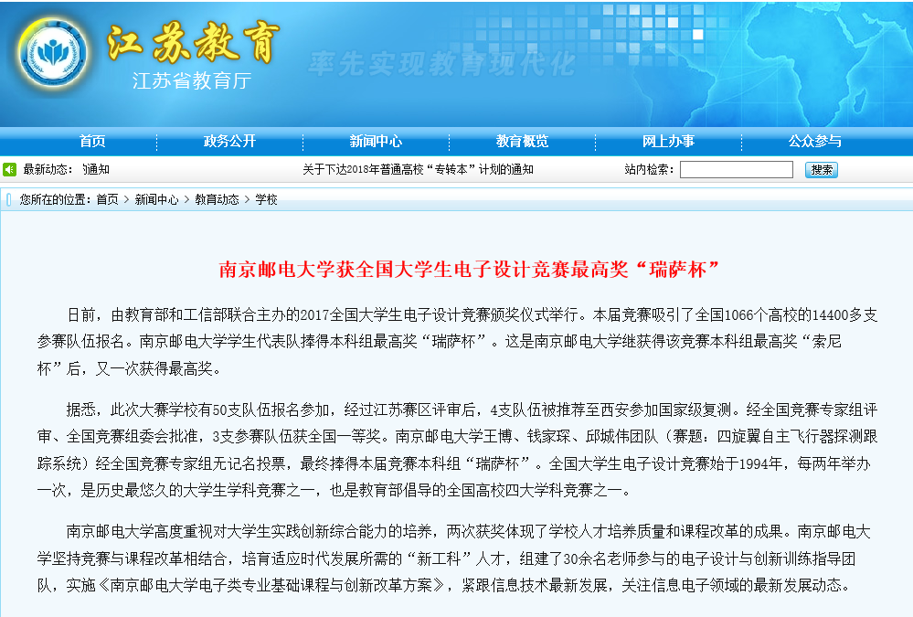 【江蘇教育】南京郵電大學獲全國大學生電子設計競賽最高獎“瑞薩杯”