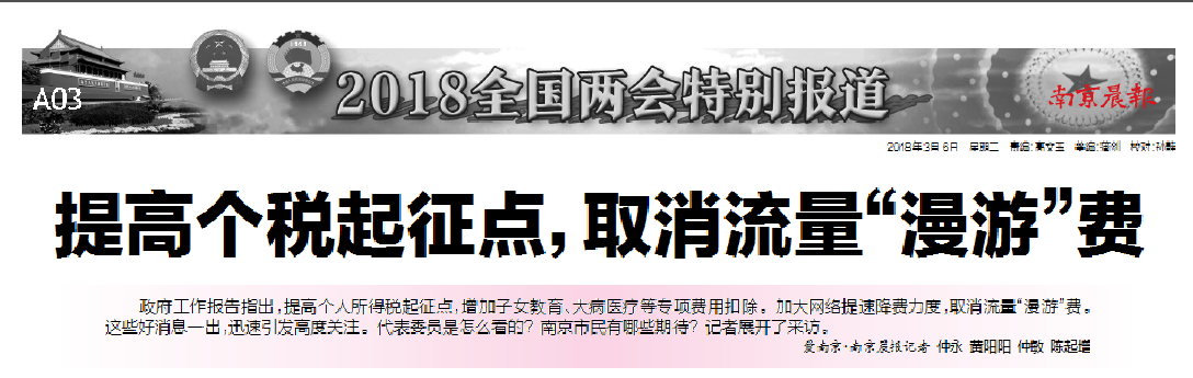 【南京晨報(bào)】提高個(gè)稅起征點(diǎn),取消流量“漫游”費(fèi)
