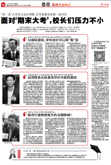 備受關(guān)注的國家“雙一流”大學(xué)名單于去年9月公布,江蘇共有15所高校入選。大學(xué)“雙一流”建設(shè)不搞終身制,將有進有退動態(tài)調(diào)整,2020年就會迎來首次“期末評價”。面對這場“大考”,江蘇幾位“雙一流”高校的校長們紛紛表示“壓力很大”。