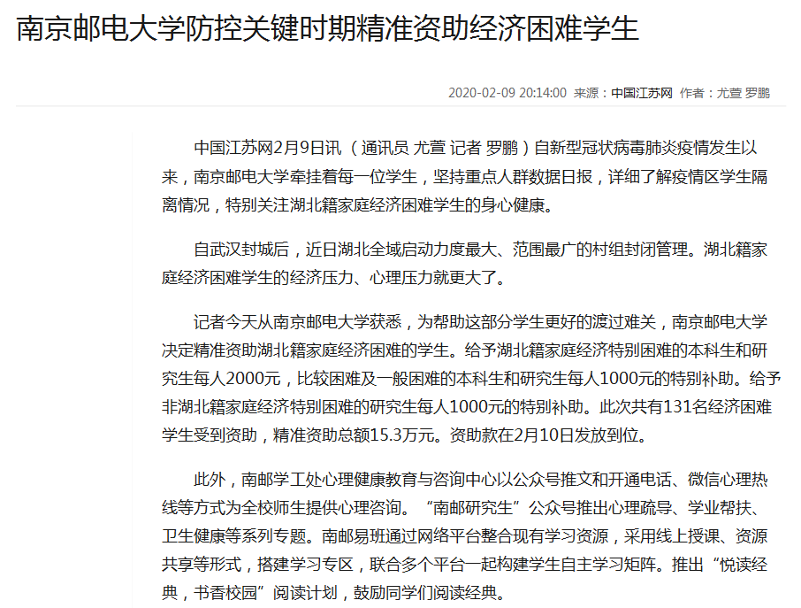 【中國江蘇網(wǎng)】南京郵電大學防控關鍵時期精準資助經(jīng)濟困難學生