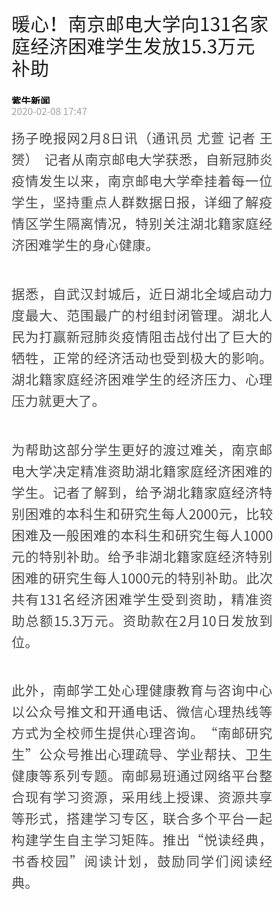 【揚子晚報網】暖心!南京郵電大學向131名家庭經濟困難學生發放15.3萬元補助