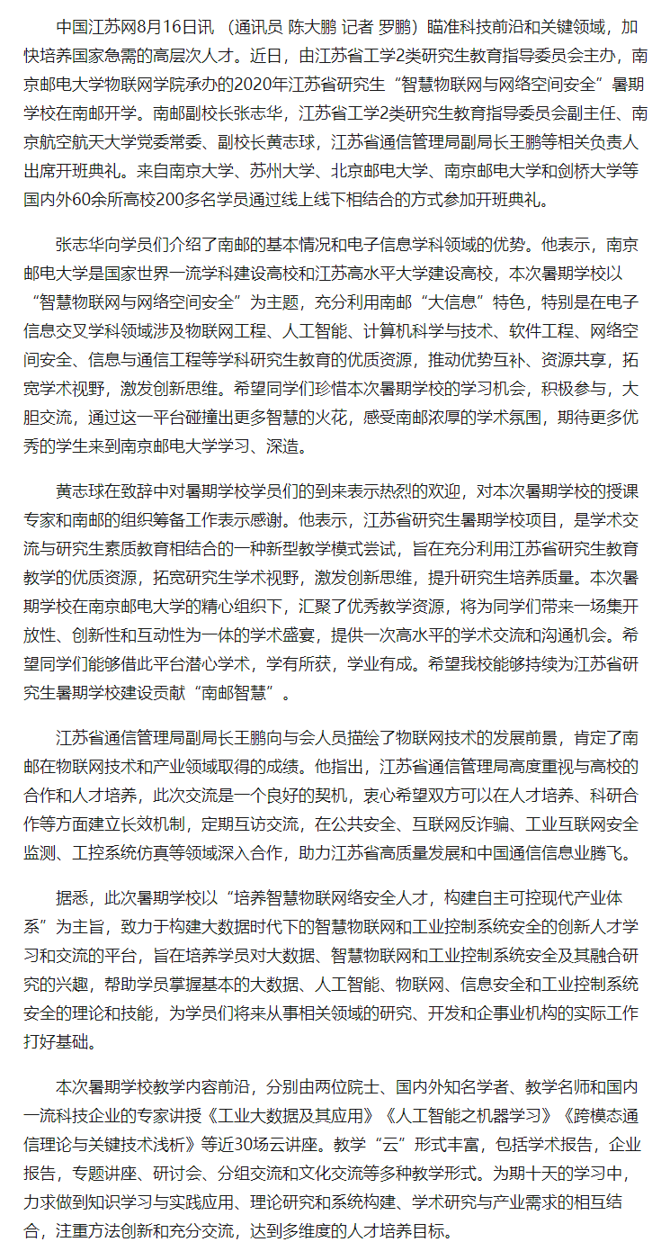【中國江蘇網(wǎng)】江蘇省研究生“智慧物聯(lián)網(wǎng)與網(wǎng)絡(luò)空間安全”暑期學(xué)校在南郵開班