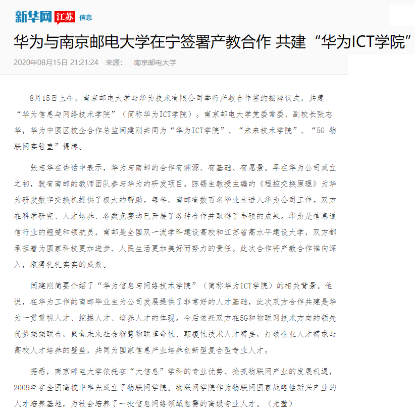 【新華網】華為與南京郵電大學在寧簽署產教合作 共建“華為ICT學院”