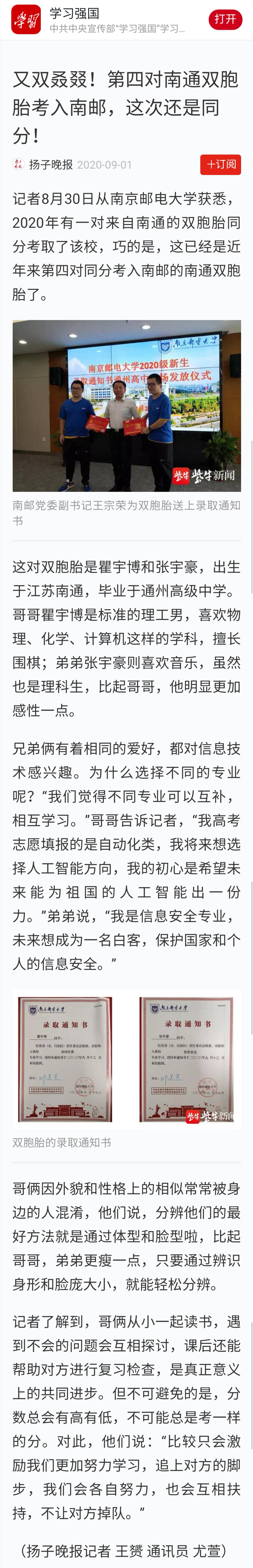 【學習強國】又雙叒叕!第四對南通雙胞胎考入南郵,這次還是同分!