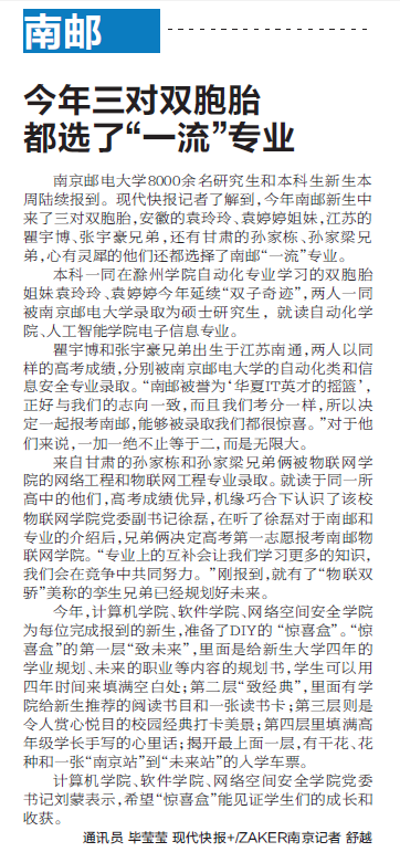 【現代快報】南郵:今年三對雙胞胎都選了“一流”專業