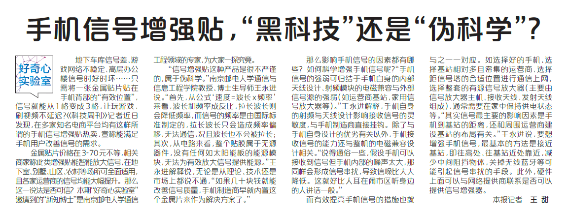 【新華日報(bào)】手機(jī)信號(hào)增強(qiáng)貼,“黑科技”還是“偽科學(xué)”