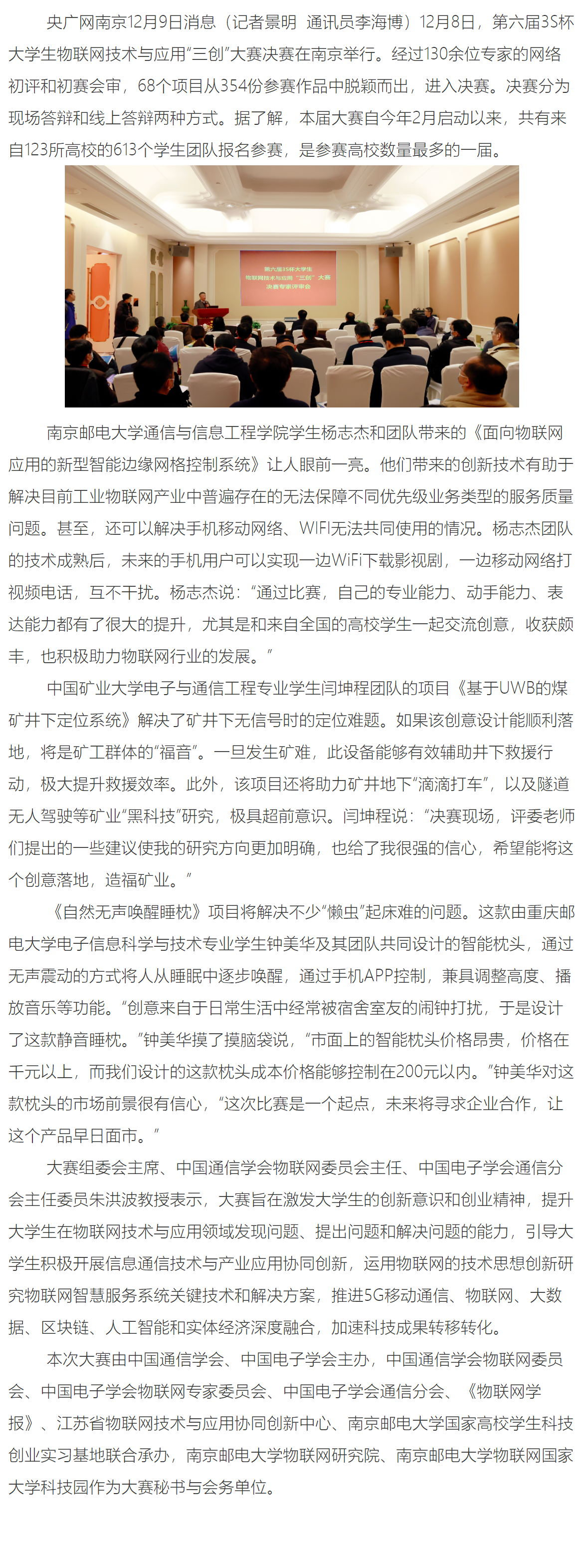 【中央廣播電視總臺央廣網】第六屆大學生物聯網“三創”大賽決賽在南京舉行