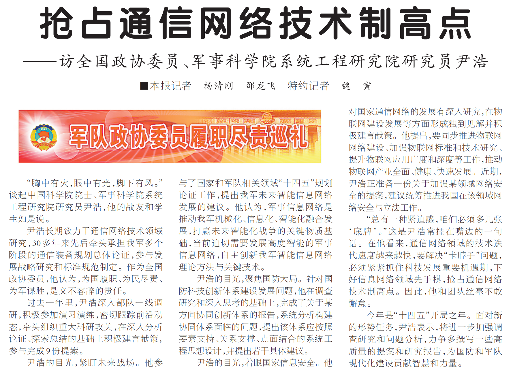 【解放軍報】搶占通信網絡技術制高點——訪全國政協委員、軍事科學院系統工程研究院研究員尹浩