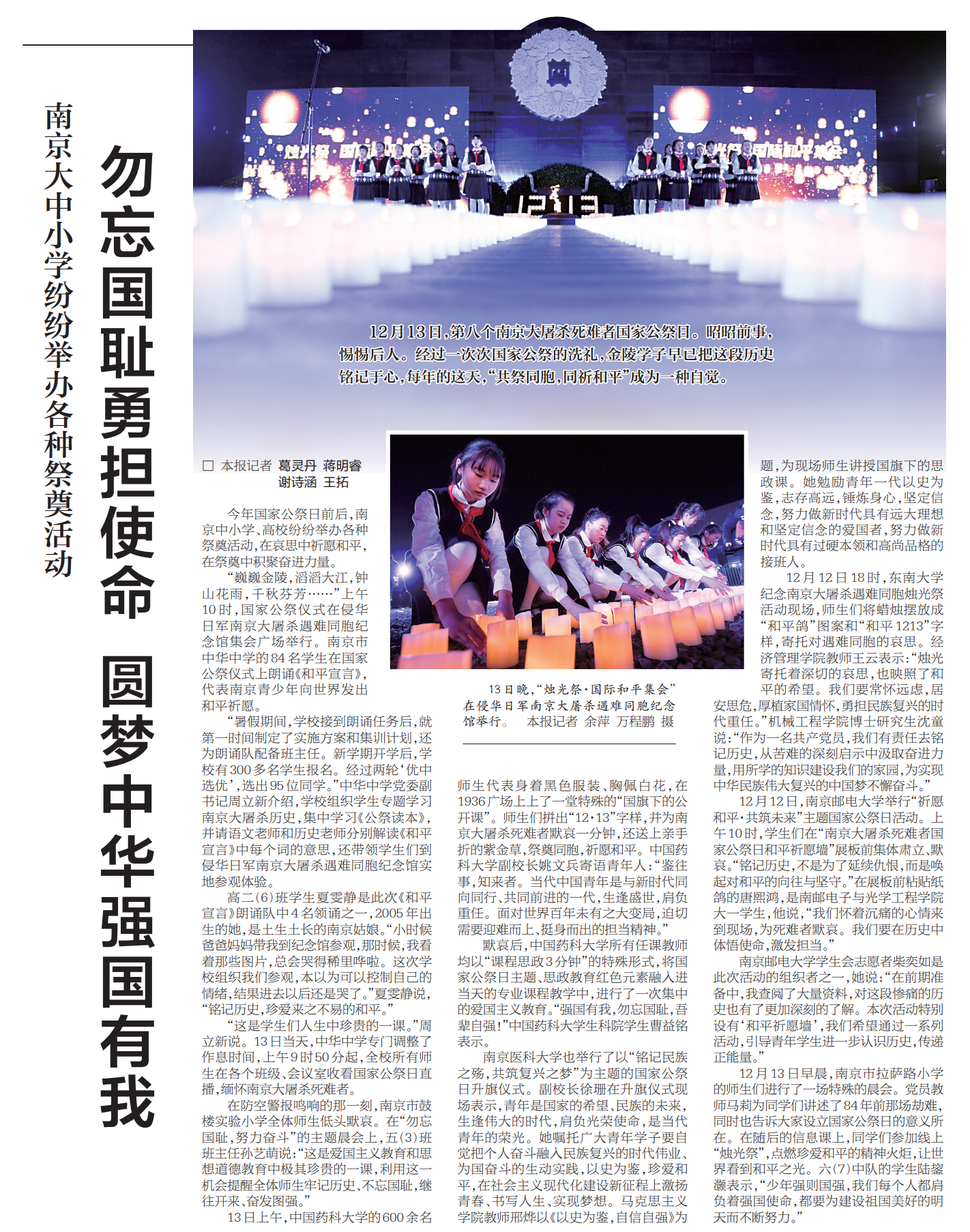 【新華日報】南京大中小學(xué)紛紛舉辦各種祭奠活動 勿忘國恥勇?lián)姑?圓夢中華強國有我