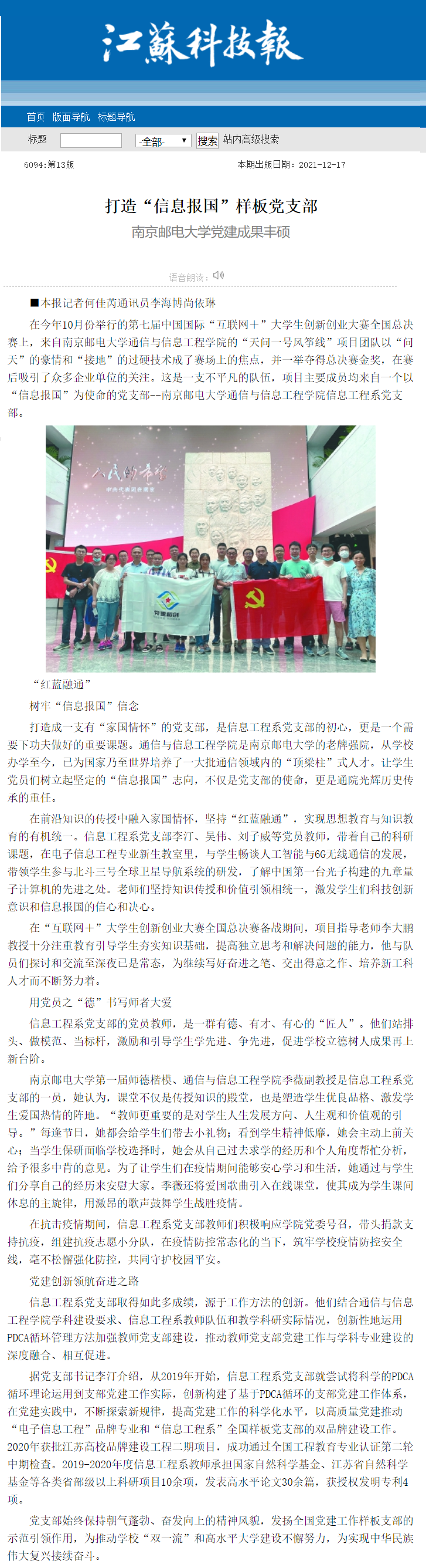 【江蘇科技報】打造“信息報國”樣板黨支部 南京郵電大學黨建成果豐碩