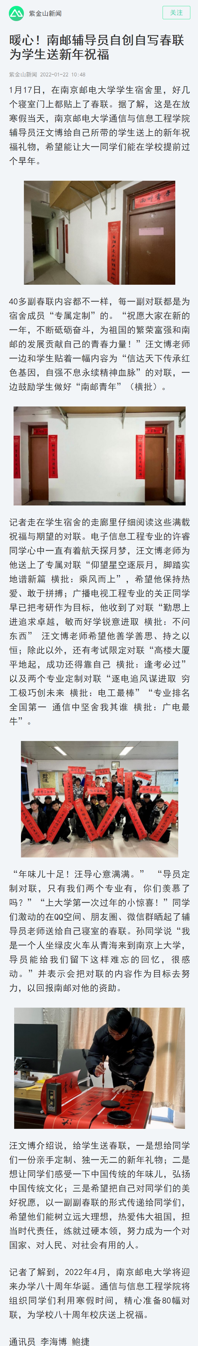 【南京日報客戶端】暖心!南郵輔導員自創自寫春聯為學生送新年祝福