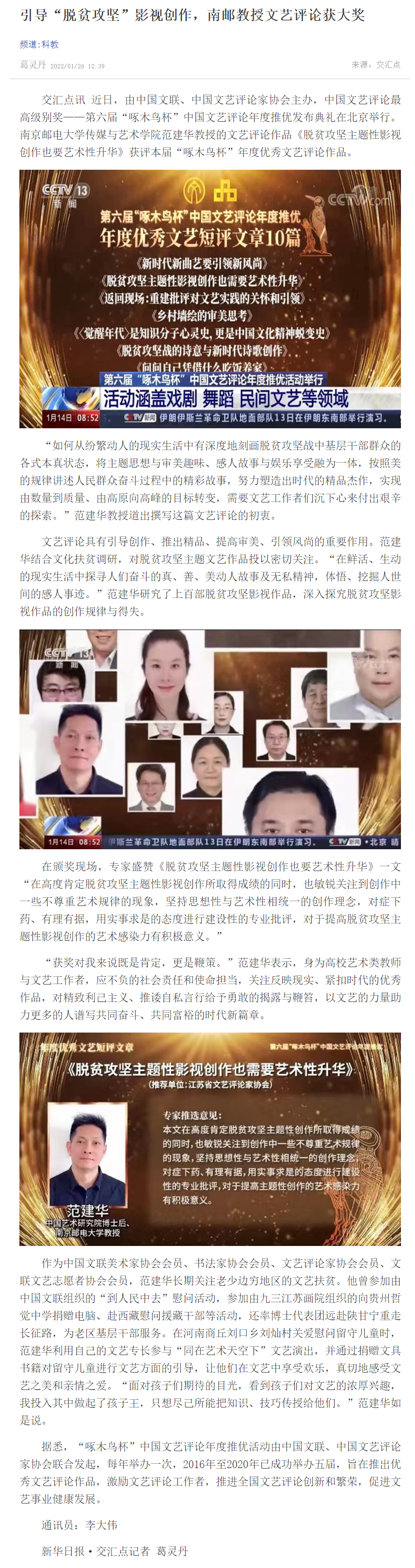 【新華日報客戶端】引導“脫貧攻堅”影視創(chuàng)作,南郵教授文藝評論獲大獎