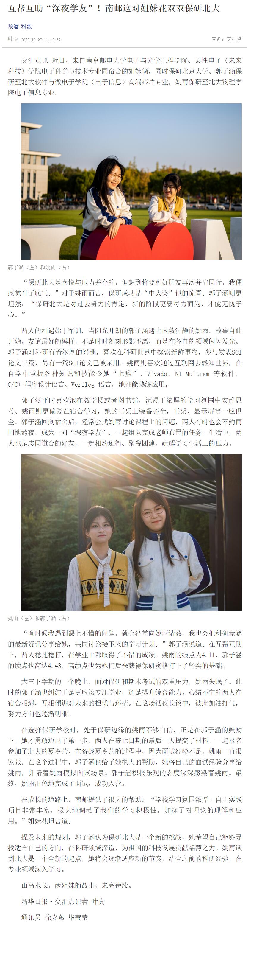 【新華日報客戶端】互幫互助“深夜學友”!南郵這對姐妹花雙雙保研北大