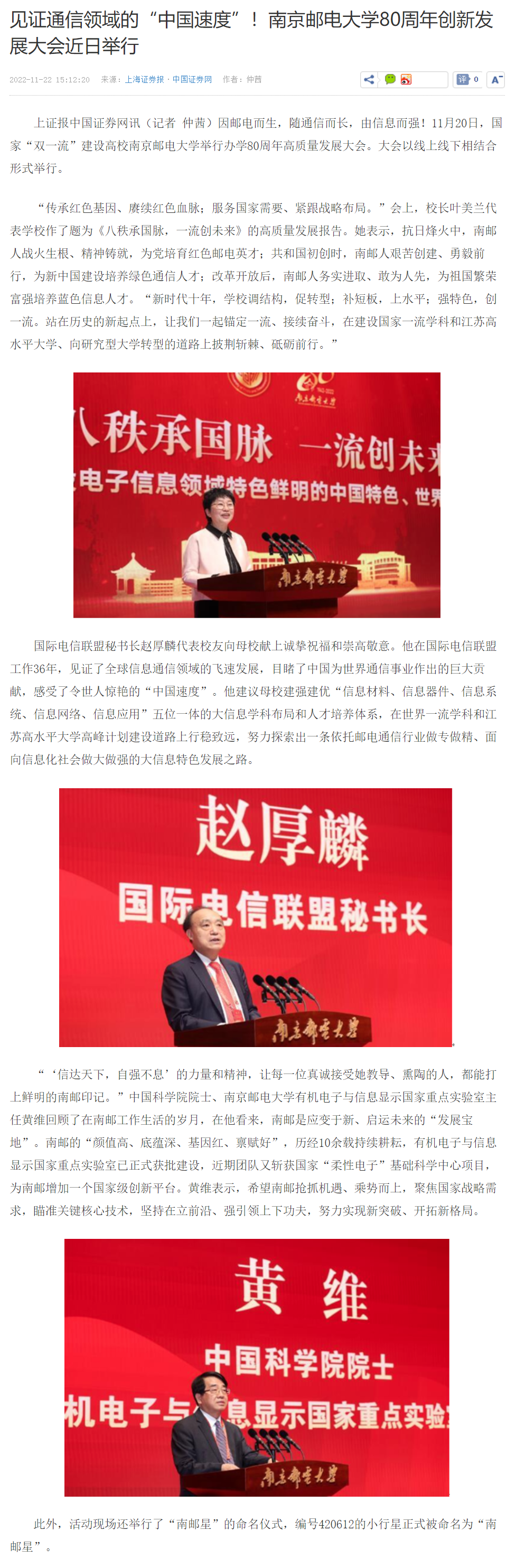 【上海證券報】見證通信領域的“中國速度”!南京郵電大學80周年創新發展大會近日舉行
