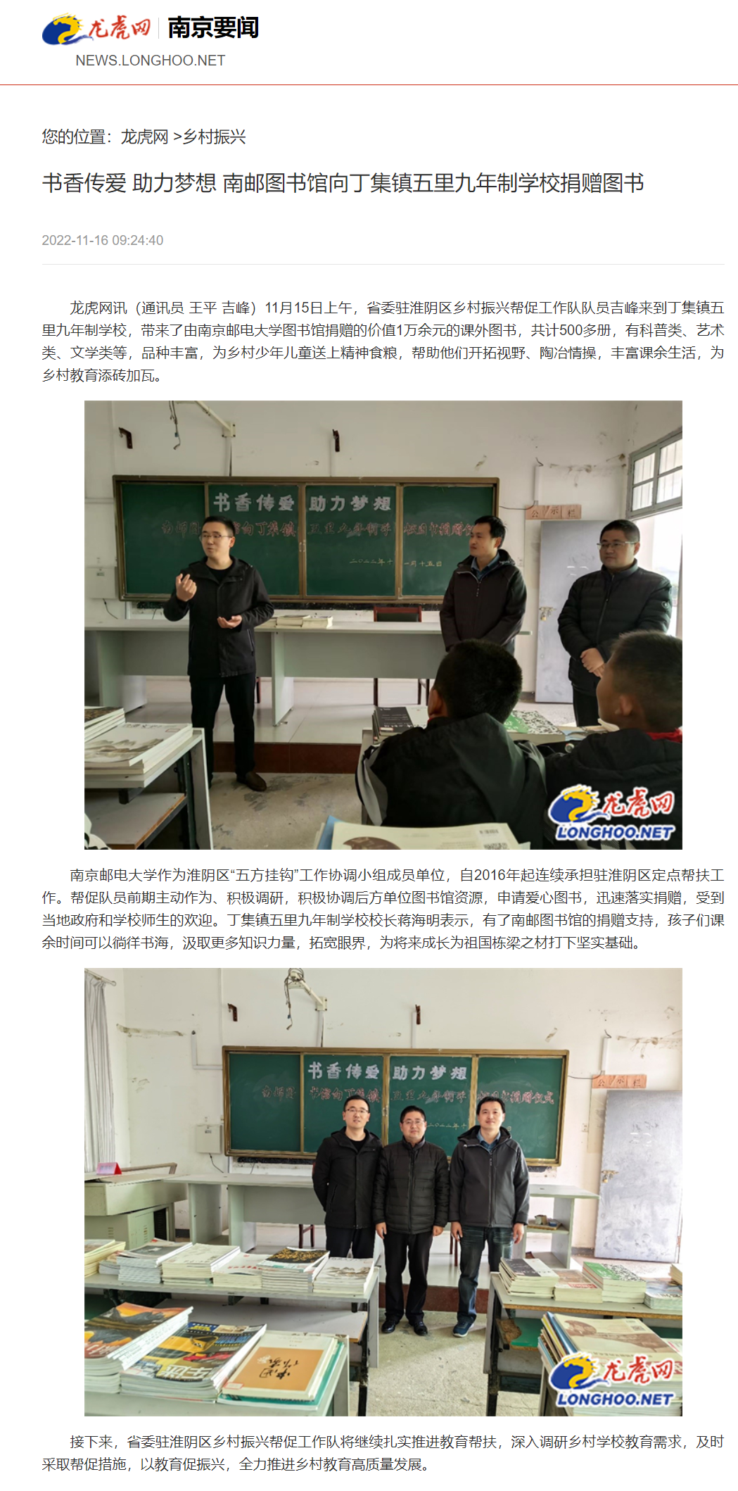 【龍虎網】書香傳愛 助力夢想 南郵圖書館向丁集鎮五里九年制學校捐贈圖書