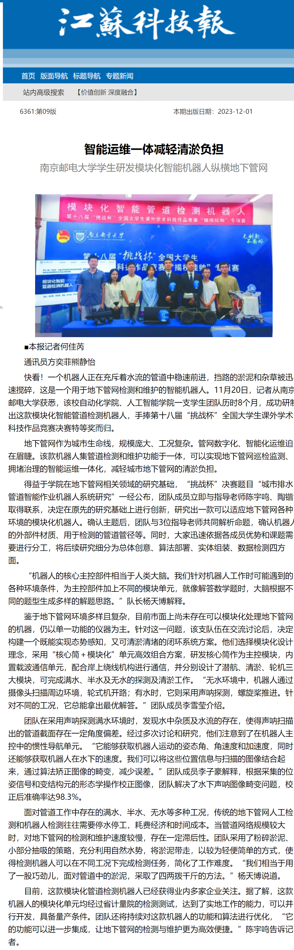 【江蘇科技報】智能運維一體減輕清淤負擔南京郵電大學學生研發模塊化智能機器人縱橫地下管網