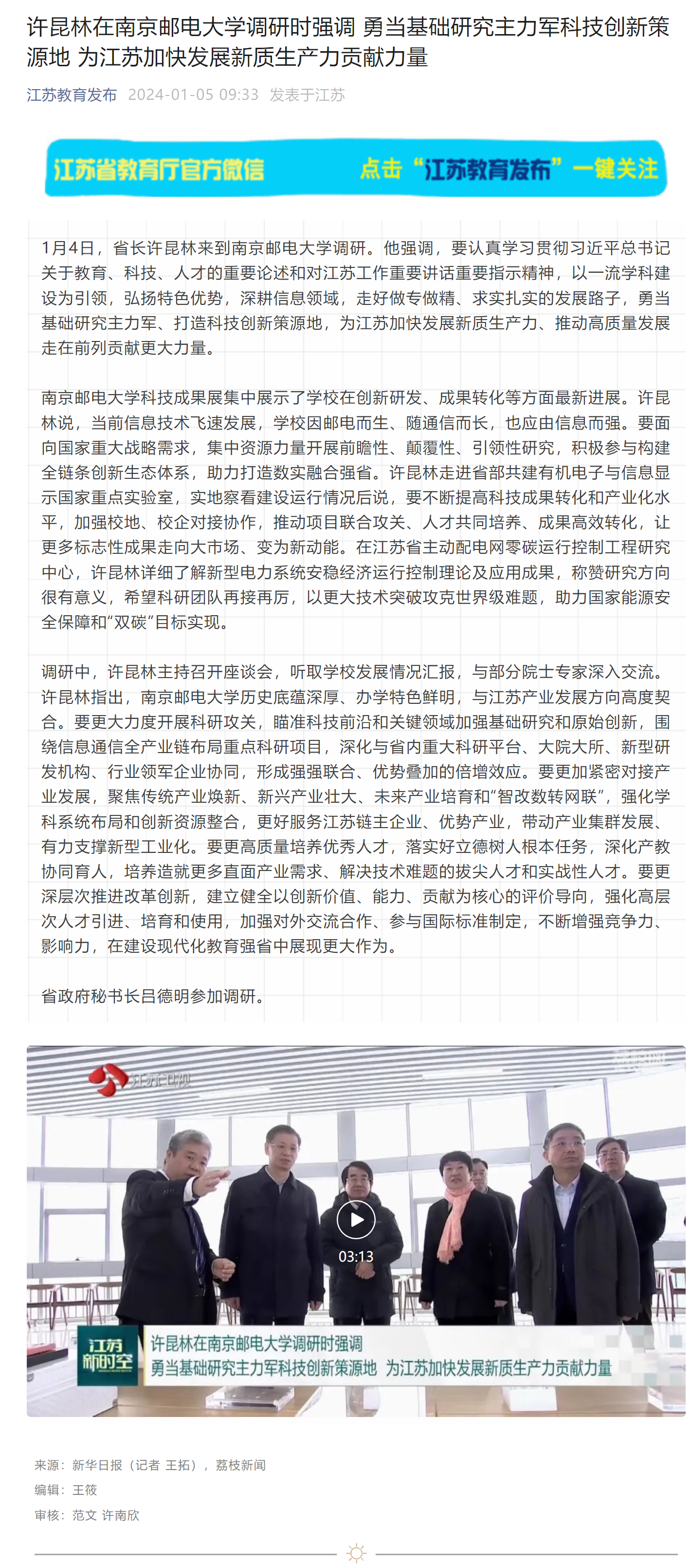 【省教育廳官微】許昆林在南京郵電大學調研時強調 勇當基礎研究主力軍科技創新策源地 為江蘇加快發展新質生產力貢獻力量