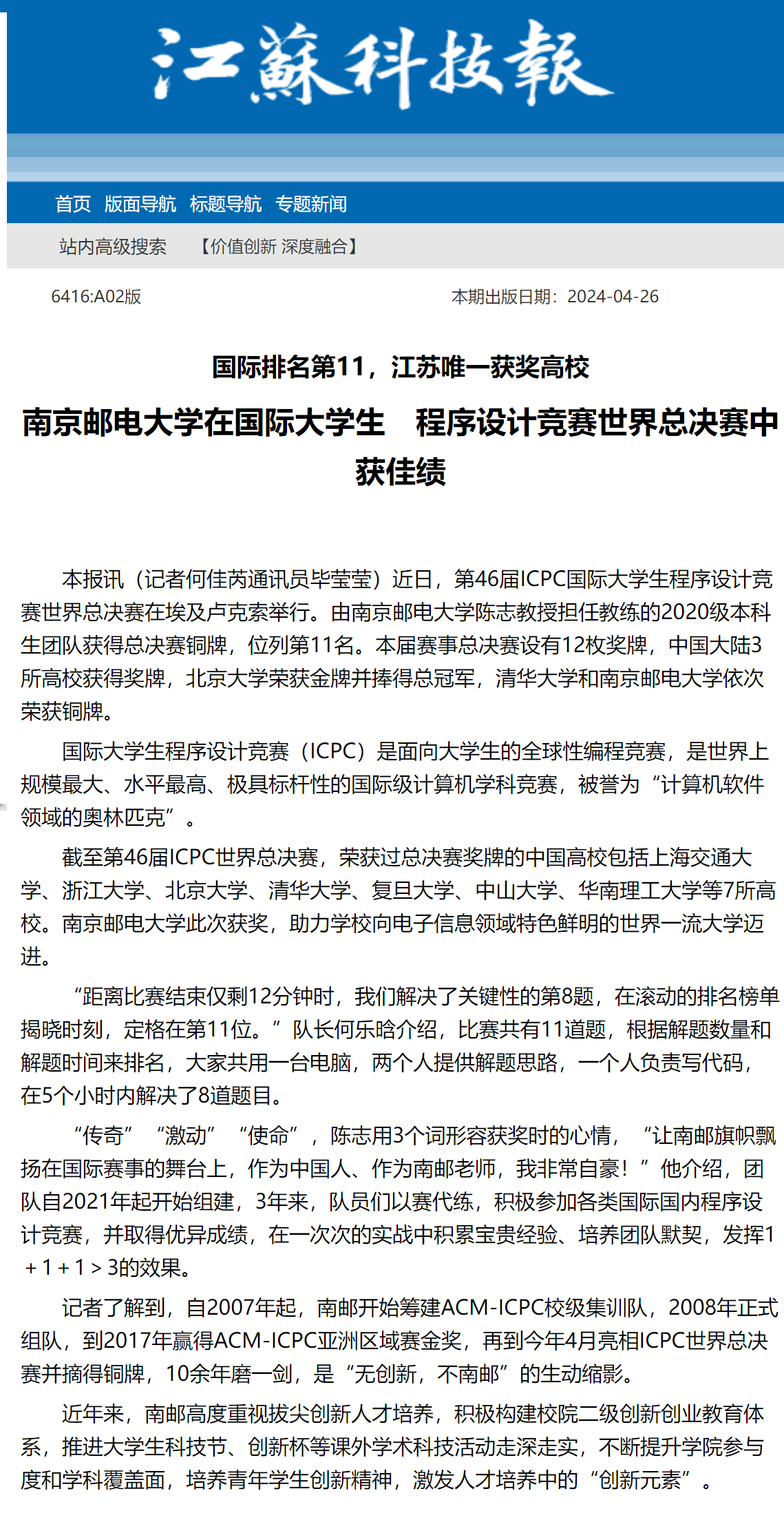 【江蘇科技報】南京郵電大學在國際大學生程序設計競賽世界總決賽中獲佳績
