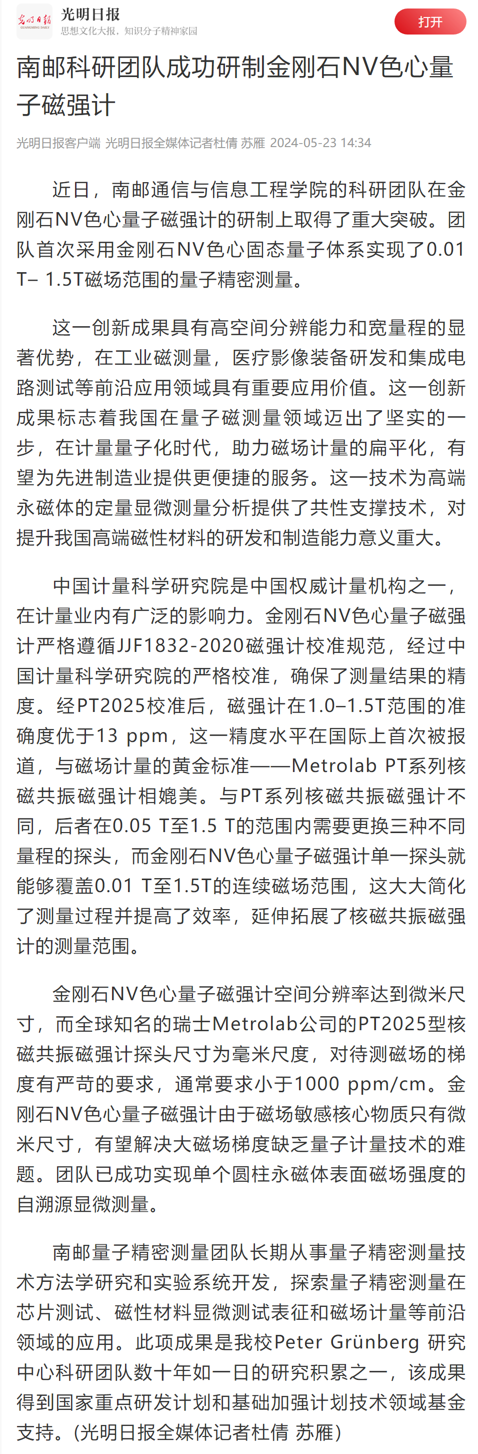 【光明日報(bào)客戶端】南郵科研團(tuán)隊(duì)成功研制金剛石NV色心量子磁強(qiáng)計(jì)