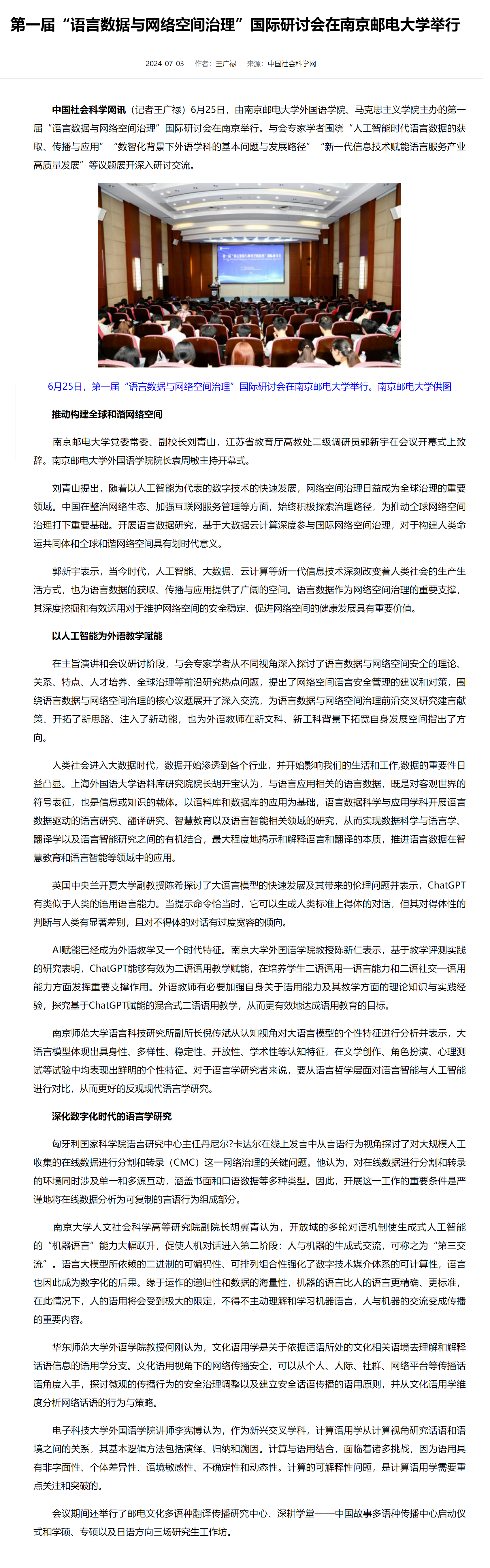 【中國社會科學網】第一屆“語言數據與網絡空間治理”國際研討會在南京郵電大學舉行
