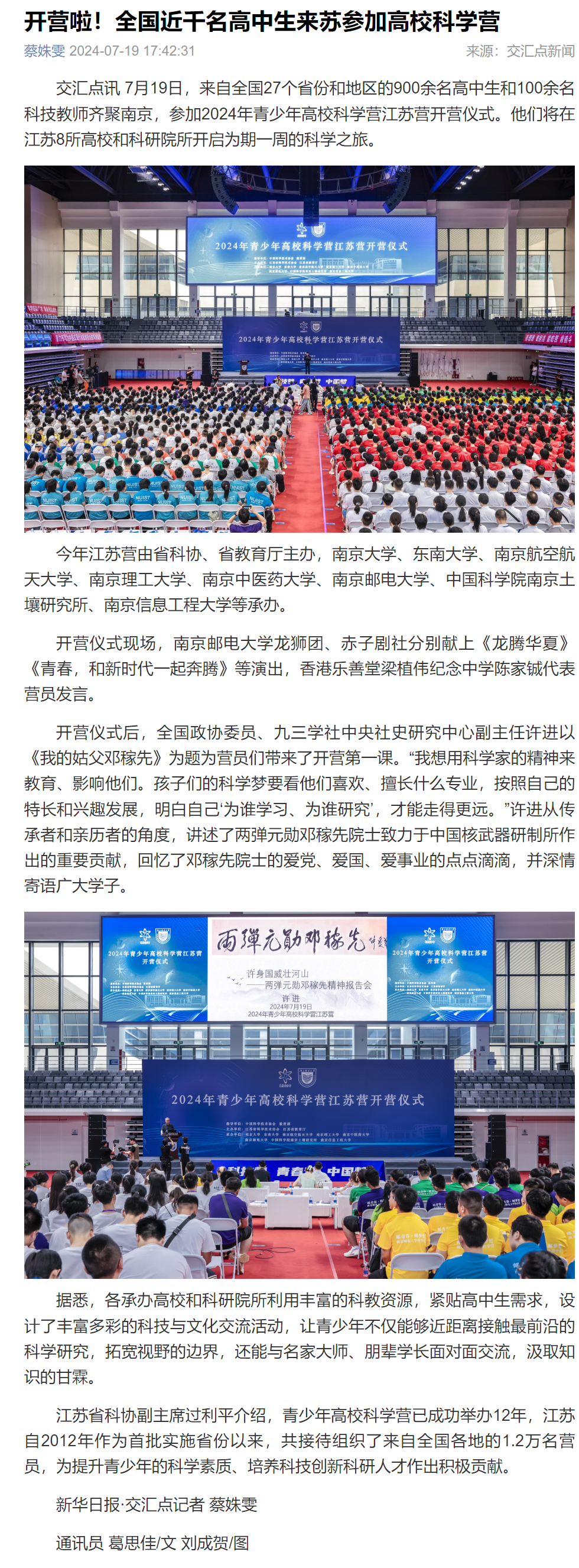 【新華日報客戶端】開營啦!全國近千名高中生來蘇參加高校科學營