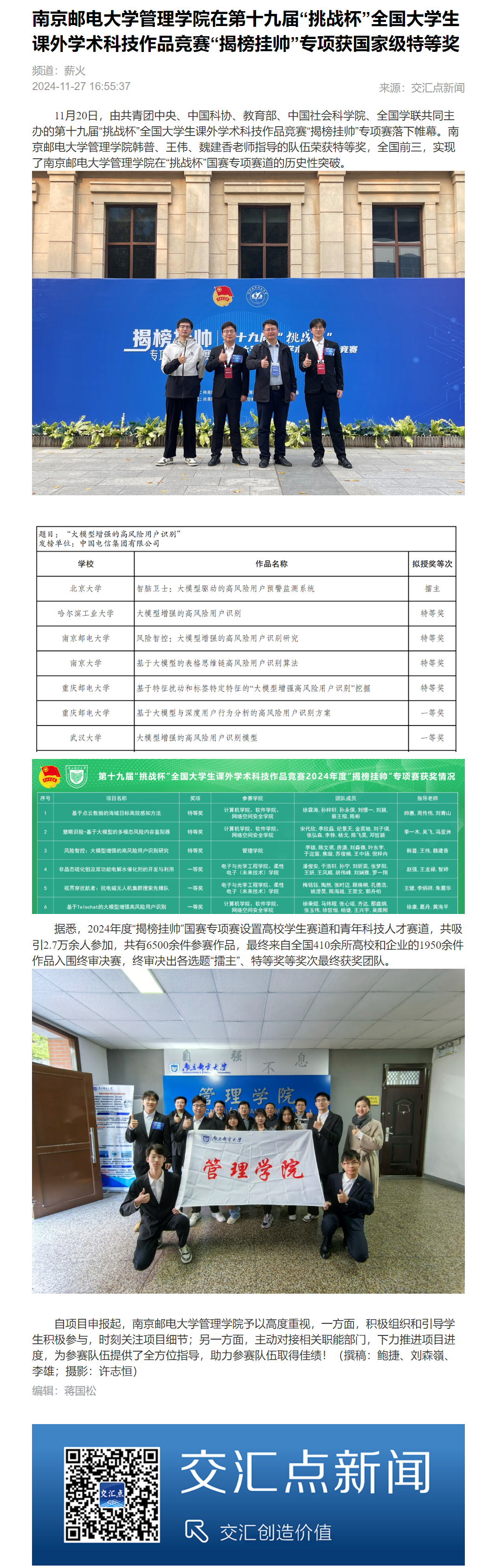 【新華日報客戶端】南京郵電大學管理學院在第十九屆“挑戰杯”全國大學生課外學術科技作品競賽“揭榜掛帥”專項獲國家級特等獎