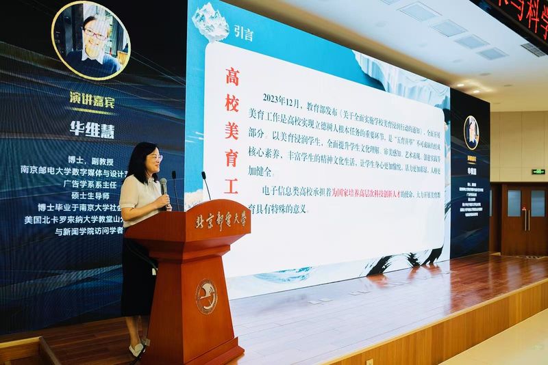 在論壇環節,南郵數字媒體與設計藝術學院華維慧副教授作《人工智能賦能電子信息類高校美育教育體系的創新與實踐》主旨發言,介紹南郵“紅色鑄魂、數字賦能,育一流信息人才”的美育工作思路以及“一核兩翼三階”的特色美育體系。