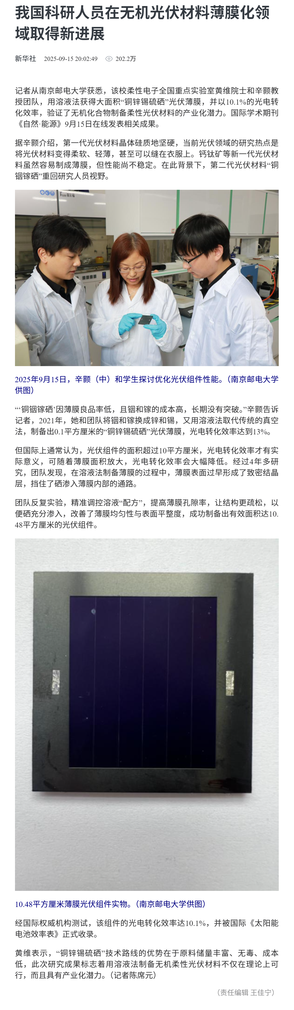 【新華網(wǎng)客戶端】我國科研人員在無機光伏材料薄膜化領域取得新進展