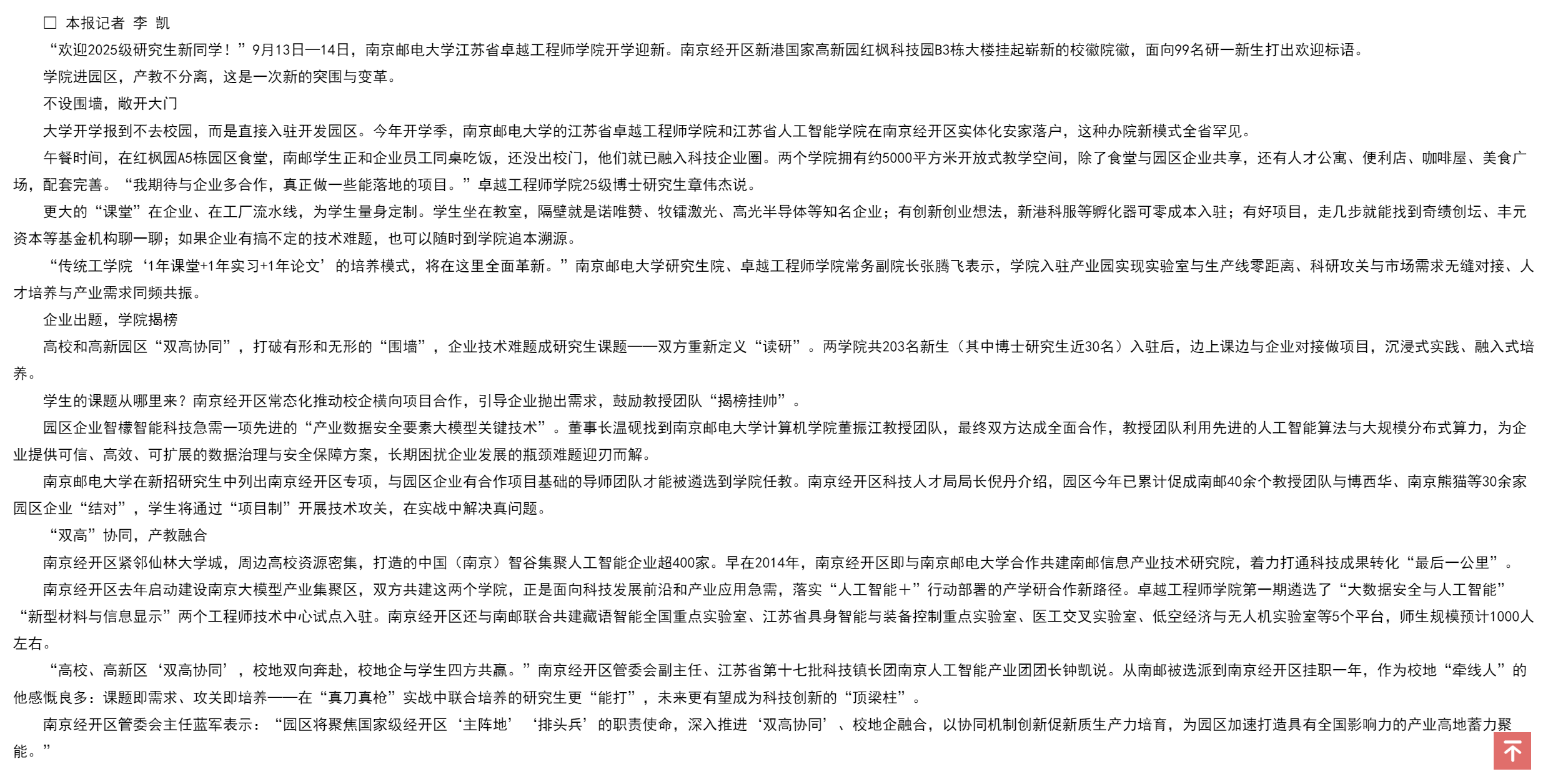 【新華日?qǐng)?bào)頭版】南京郵電大學(xué)兩個(gè)學(xué)院落戶南京經(jīng)開(kāi)區(qū)——左手課堂右手企業(yè),“雙高”重新定義“讀研”