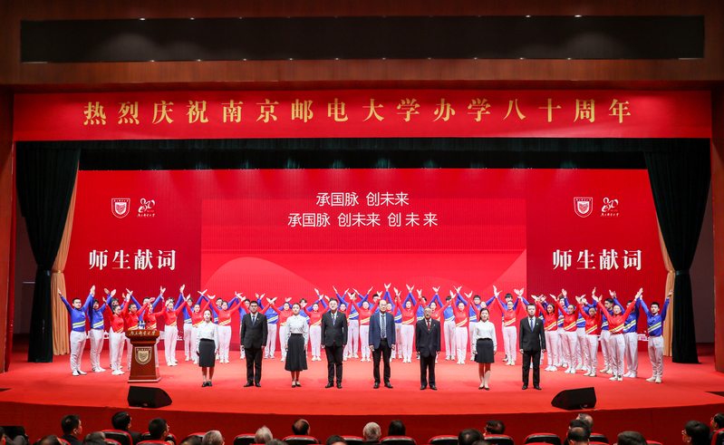 校長(zhǎng)葉美蘭代表學(xué)校作了題為《八秩承國(guó)脈 一流創(chuàng)未來》的高質(zhì)量發(fā)展報(bào)告。她回望南郵因郵電而生,隨通信而長(zhǎng),由信息而強(qiáng)的八十年辦學(xué)歷程,抗日烽火中,熱血鑄魂,南郵人戰(zhàn)火生根、精神鑄就,為黨培育紅色郵電英才;共和國(guó)初創(chuàng)時(shí),篳路藍(lán)縷,南郵人艱苦創(chuàng)建、勇毅前行,為新中國(guó)建設(shè)培養(yǎng)綠色通信人才;改革開放后,勇立潮頭,南郵人務(wù)實(shí)進(jìn)取、敢為人先,為祖國(guó)繁榮富強(qiáng)培養(yǎng)藍(lán)色信息人才。八十載國(guó)脈擔(dān)當(dāng),八十載信息報(bào)國(guó),南郵從抗戰(zhàn)烽火中走來,沿著共和國(guó)的紅色大道,留下了八十載與黨和國(guó)家同向同行的奮進(jìn)足跡。南郵的80年,是傳承紅色基因、賡續(xù)紅色血脈的80年;是堅(jiān)持立德樹人、哺育桃李芬芳的80年;是服務(wù)國(guó)家需要、緊跟戰(zhàn)略布局的80年。近十年來,南京郵電大學(xué)扎根中國(guó)大地,以“調(diào)結(jié)構(gòu),促轉(zhuǎn)型;補(bǔ)短板,上水平;強(qiáng)特色,創(chuàng)一流”的戰(zhàn)略思想為指引,開創(chuàng)了內(nèi)涵發(fā)展全面提升的黃金時(shí)期。這十年,是學(xué)校轉(zhuǎn)型發(fā)展、勇攀一流的新十年;是學(xué)校提升規(guī)模、追求卓越的新十年;是學(xué)校創(chuàng)新引領(lǐng)、屢結(jié)碩果的新十年。面向未來,在實(shí)施科教興國(guó)戰(zhàn)略、人才強(qiáng)國(guó)戰(zhàn)略、創(chuàng)新驅(qū)動(dòng)發(fā)展戰(zhàn)略的進(jìn)程中,全體南郵人將賡續(xù)紅色基因,懷抱山河、情懷家國(guó);將矢志追求卓越,馳而不息、勇創(chuàng)一流;將堅(jiān)持傳承創(chuàng)新,特色發(fā)展、篤行致遠(yuǎn)。攜手并肩,錨定一流、接續(xù)奮斗,在建設(shè)國(guó)家一流學(xué)科和江蘇高水平大學(xué)、向研究型大學(xué)轉(zhuǎn)型的道路上披荊斬棘、砥礪前行!在實(shí)現(xiàn)中華民族偉大復(fù)興的征程中燃燒激情、揮灑汗水!共建偉大祖國(guó),共創(chuàng)美好南郵!