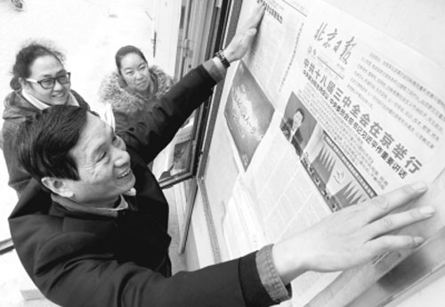北京市西城區金融街街道東太平社區的工作人員把報紙掛到報欄上,方便社區居民學習。CFP
