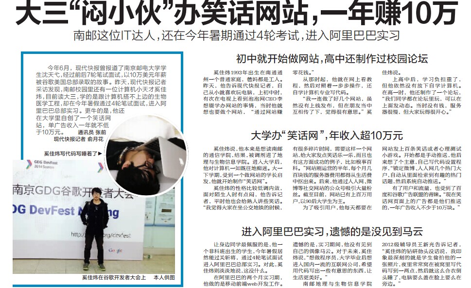 【現代快報】大三“悶小伙"辦笑話網站,一年賺10萬