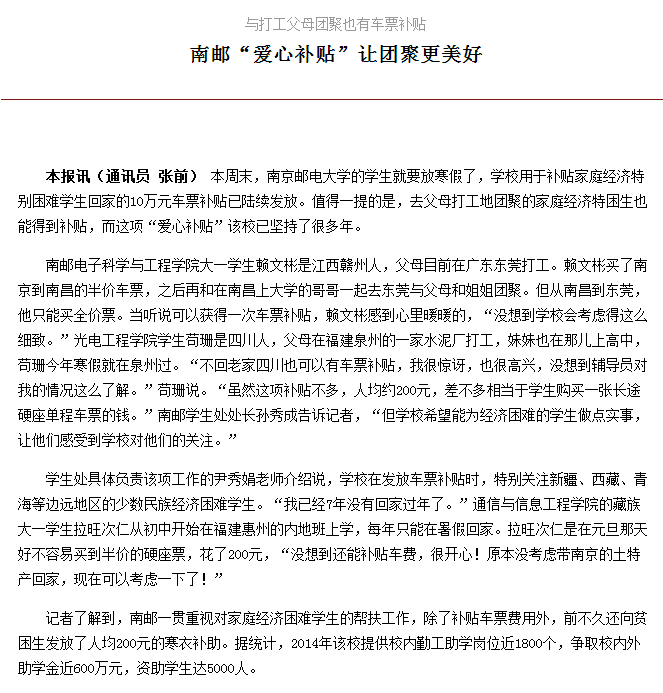 【江蘇教育報】南郵“愛心補貼”讓團聚更美好
