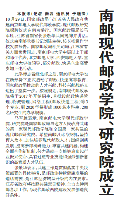【中國郵政快遞報】南郵現(xiàn)代郵政學院、研究院成立