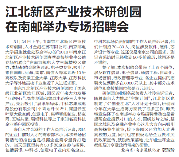 【南京晨報(bào)】江北新區(qū)產(chǎn)業(yè)技術(shù)研創(chuàng)園 在南郵舉辦專(zhuān)場(chǎng)招聘會(huì)