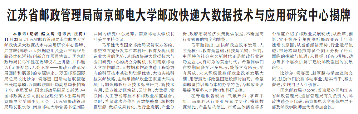 【中國郵政快遞報】江蘇省郵政管理局南京郵電大學郵政快遞大數據技術與應用研究中心揭牌