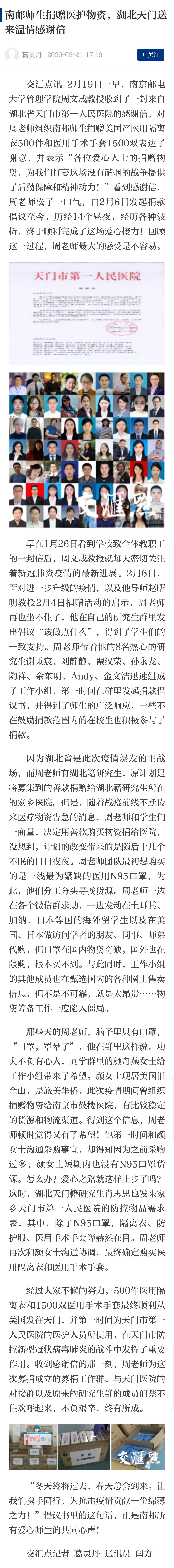 | 【交匯點】南郵師生捐贈醫護物資,湖北天門送來溫情感謝信 |
