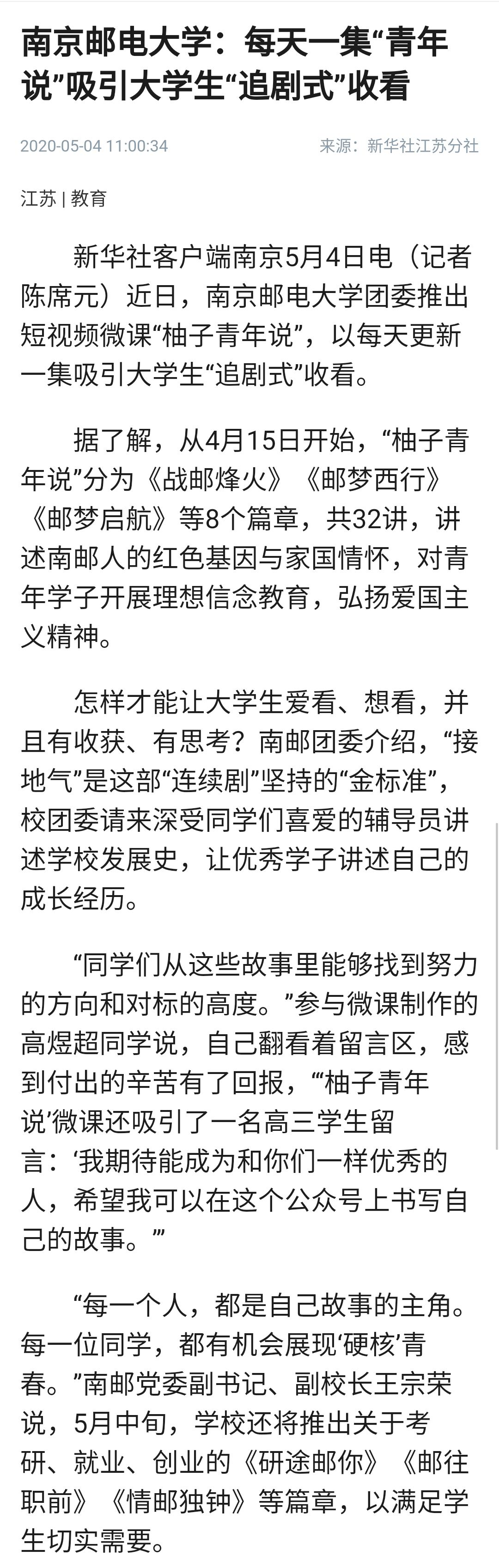 | 【新華社客戶端】南京郵電大學(xué):每天一集“青年說(shuō)”吸引大學(xué)生“追劇式”收看 |