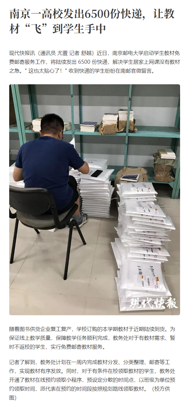 | 【現代快報網】南京一高校發出6500份快遞,讓教材“飛”到學生手中 |