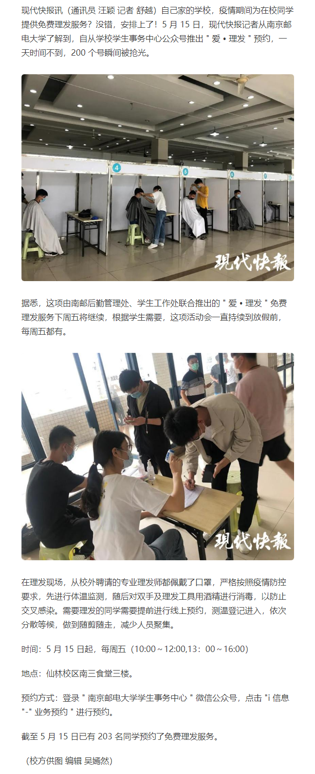| 【現(xiàn)代快報網(wǎng)】Tony老師來了!江蘇這所高校為在校生免費提供理發(fā)服務(wù) |