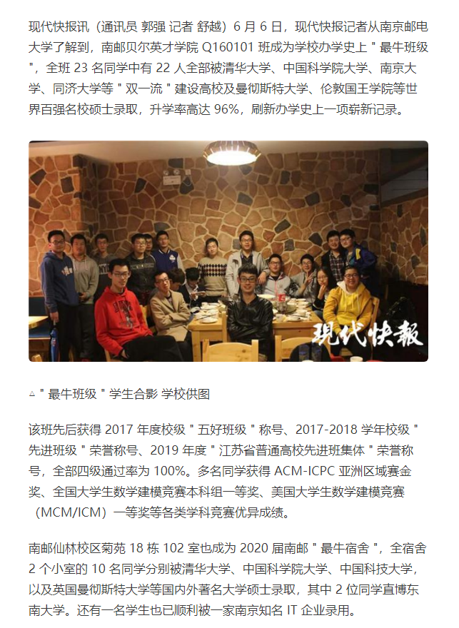 | 【現(xiàn)代快報客戶端】清華、中科大、南大......南郵“最牛班級”刷新紀錄,升學(xué)率達96% |