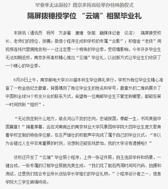 | 【南京日?qǐng)?bào)】隔屏撥穗授學(xué)位 “云端”相聚畢業(yè)禮 |
