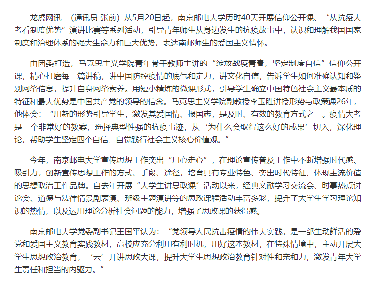 | 【龍虎網】聽抗疫故事、表達愛國情懷......南郵思政教育“用心走心” |