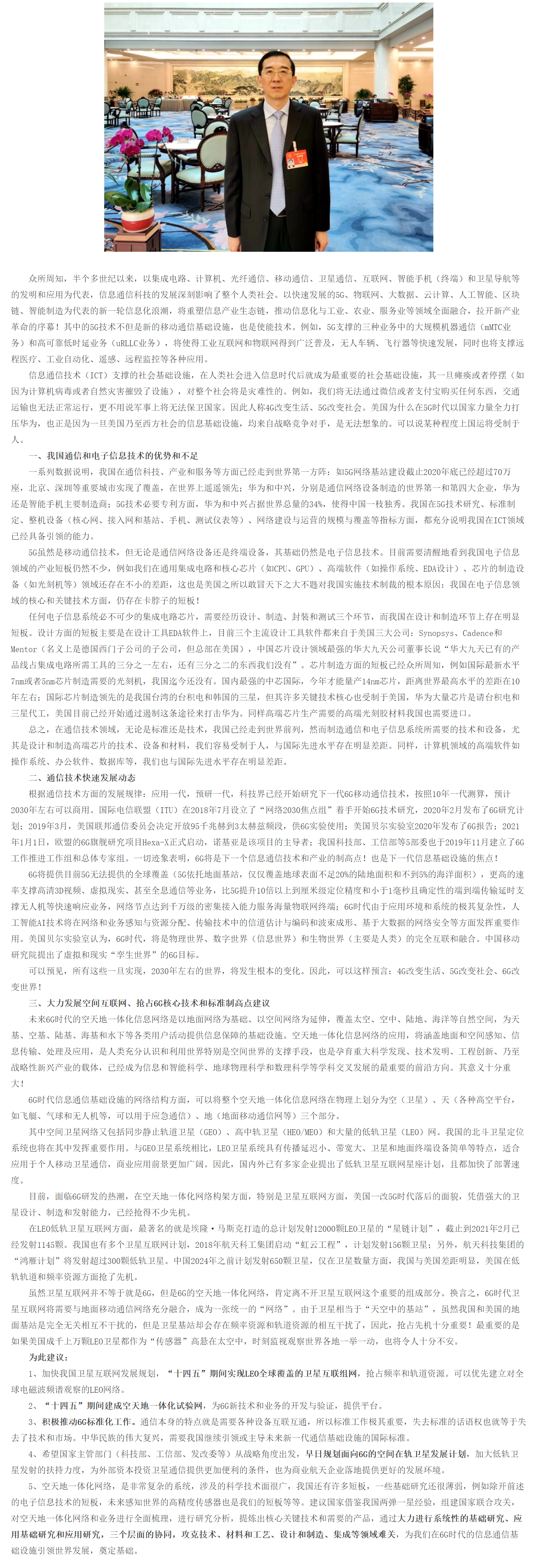 【中國農(nóng)工民主黨】楊震代表:關(guān)于大力發(fā)展空間互聯(lián)網(wǎng)、搶占6G技術(shù)和標(biāo)準(zhǔn)制高點的建議