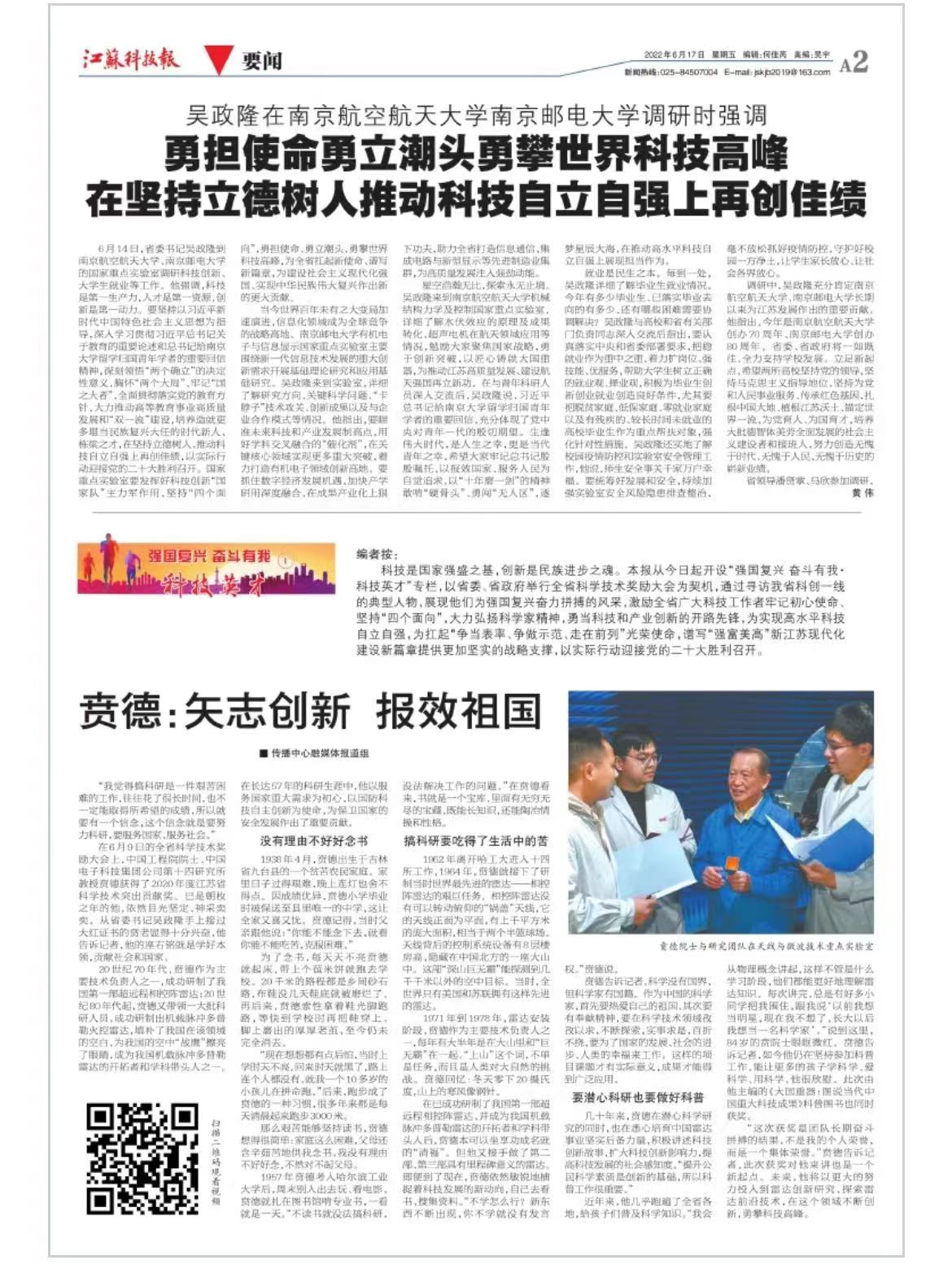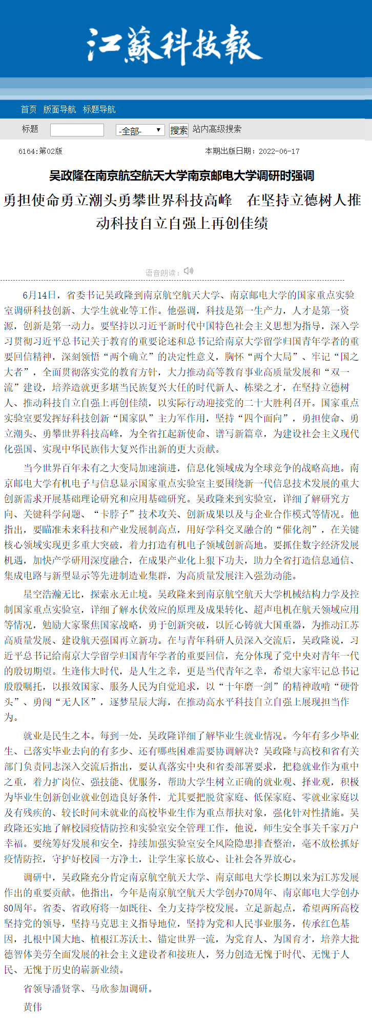 | 【江蘇科技報(bào)】吳政隆在南京航空航天大學(xué)南京郵電大學(xué)調(diào)研時(shí)強(qiáng)調(diào) 勇?lián)姑铝⒊鳖^勇攀世界科技高峰 在堅(jiān)持立德樹(shù)人推動(dòng)科技自立自強(qiáng)上再創(chuàng)佳績(jī) |
