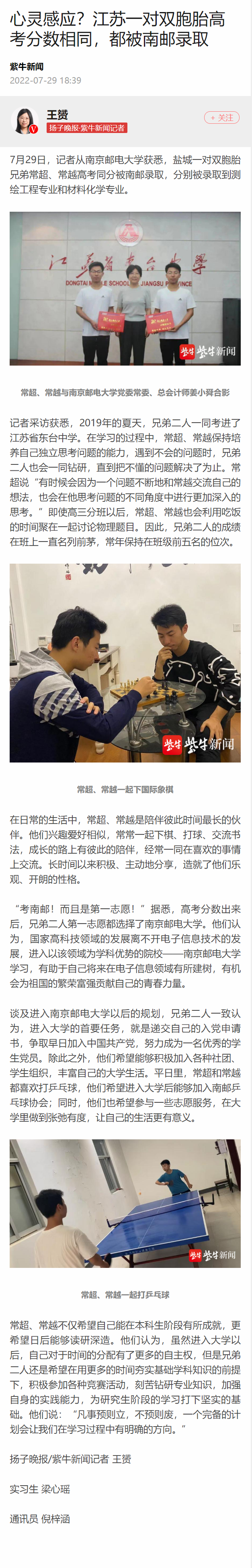 | 【揚子晚報客戶端】心靈感應?江蘇一對雙胞胎高考分數相同,都被南郵錄取 |